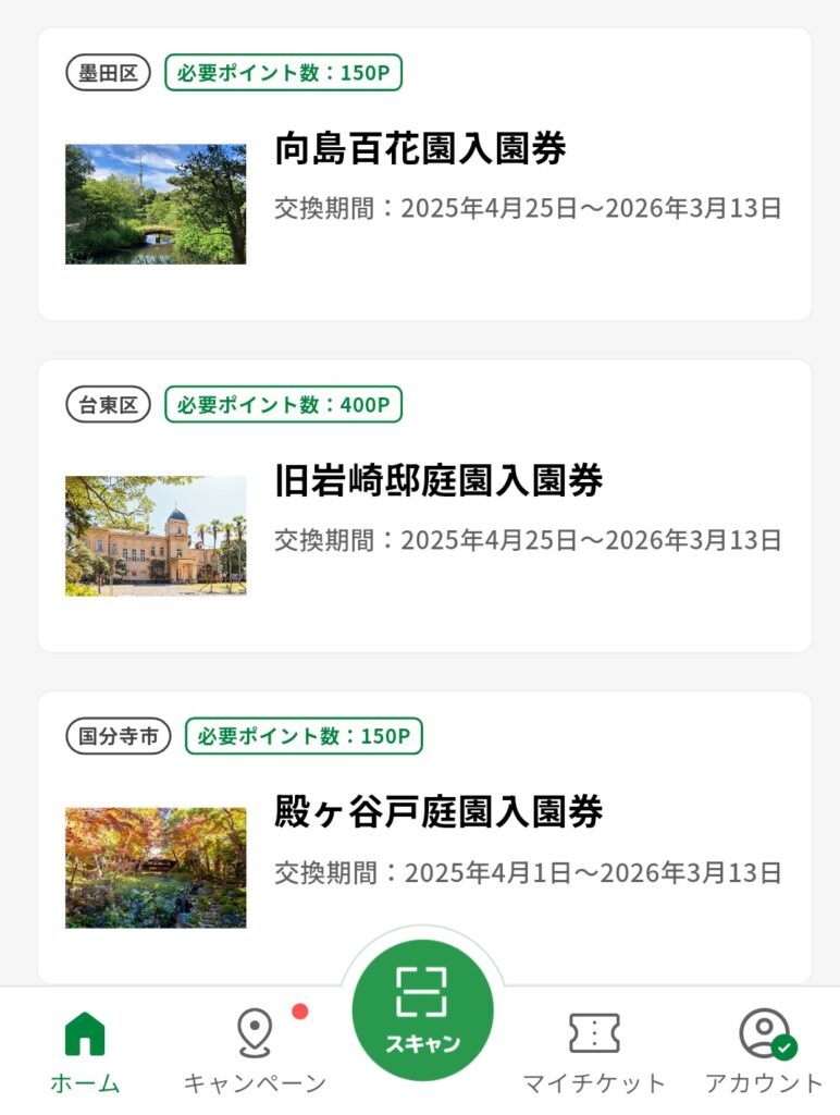 例えば、向島百花園には150Pで入園できます。旧岩崎邸庭園には400Pで入園できます。江東区のテレコムセンター展望室の入場券は500P、東京武道館のトレーニングルームも500Pで利用可能です。利用可能施設は、東京アプリ内で確認できます。他にも今のところ全部で合わせて19件の使い道があるようです。要チェックです。(でも使用期限が3月13日までだね。そこ要注意だわん〜、もしかしたら、3/13からまた違う所に使えるのかも知れないね。そして、ポイント自体は令和9年4/1まで)
