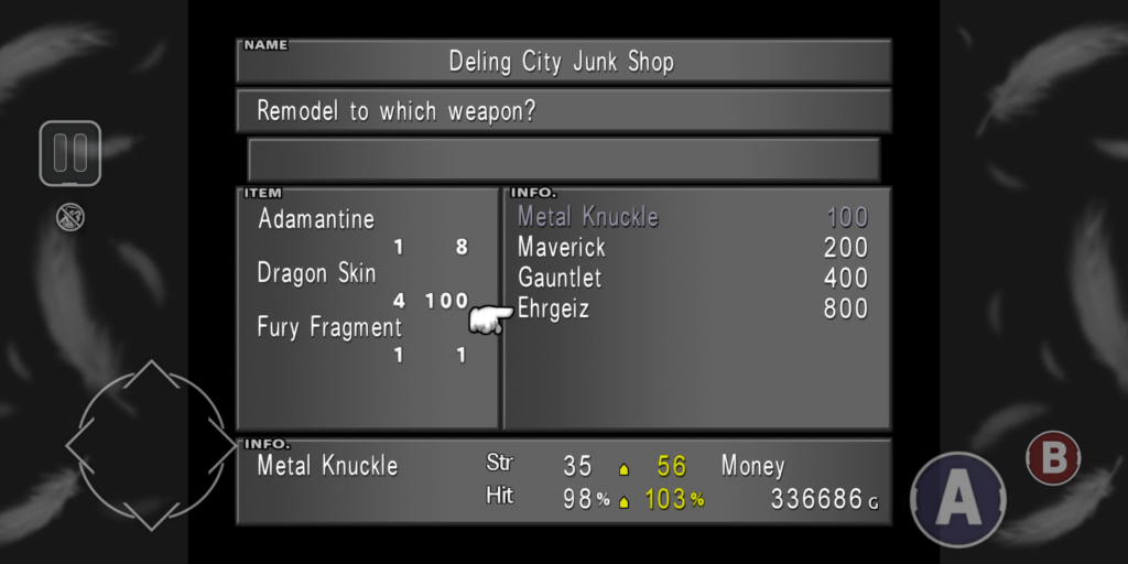 デリングシティについて、名もなき王の墓ミッションをクリアすると、セクレトとミノタウロスのカードがそれぞれ手に入りますね。そのミノタウロスのカードは、変化させると、アダマンタインになります。こちらも武器改造に必要なアイテム。手に入れたらすぐ変化させて構いませんよ。デリングシティジャンク屋に行けば、スコールの最強武器ライオンハート、セルフィの最強武器ゆめかまぼろしか、ゼルは、闘気のかけらが1つ(ドラゴンイゾルデのカード4枚)あればゼルも最強武器エアガイツに変化させることが可能!(アーヴァインだけ、月の石はどうしてもこの段階で手に入らない)