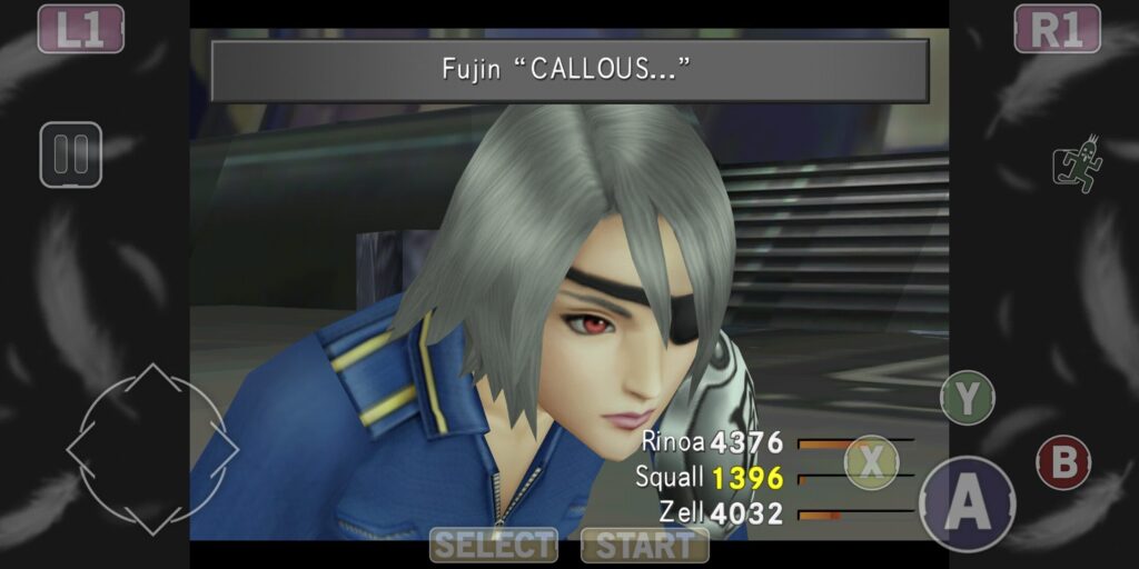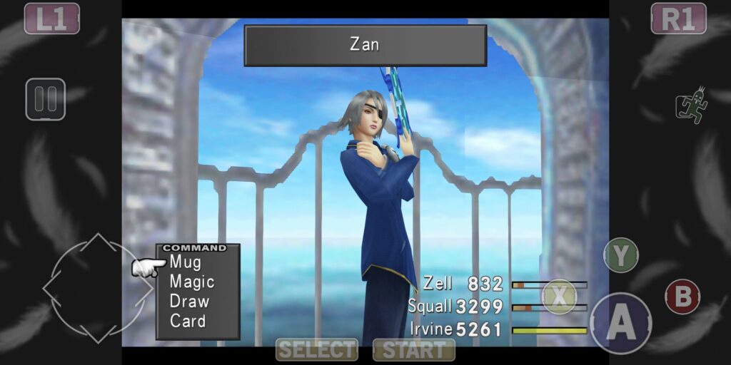 次は敵になって登場。いつの間にかガーデンを離れていた模様。恐らくだけど、伝令として走り回って、バラムの街にも行ってくれたに違いない。そして、ガルバディアガーデンがバラムに来て、そのガルバディアガーデンから降りてきたのがサイファー。ようやく再会し、サイファーの右腕、指揮官司令官に任命された。んだと思う。青きバラムホテルで風神・雷神に再会。先にホテル前で雷神とガ兵×2と戦闘。