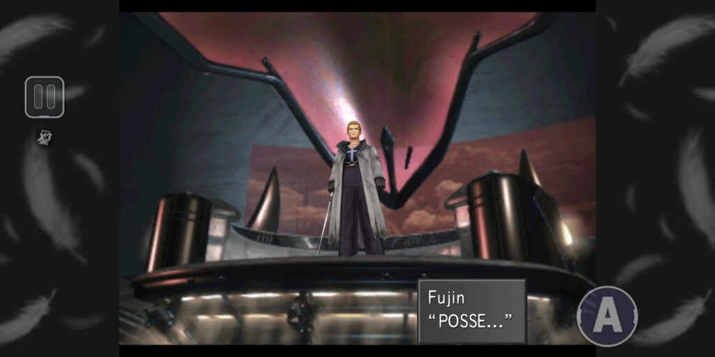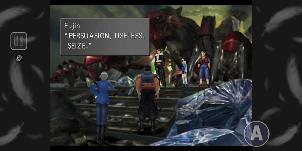 エルオーネを取り返しに来たスコール達を迎え撃ちますが、負けてしまう。機械にやらせるも撃破されてしまう。人質までとって魔女の言いなりになり人を傷つけるサイファーを見かねて、風神が…あの単語でしか話さない風神が、重い口を開きます。気持ちを伝えるべく、頑張って話をするシーン。風神、話。我、泣。