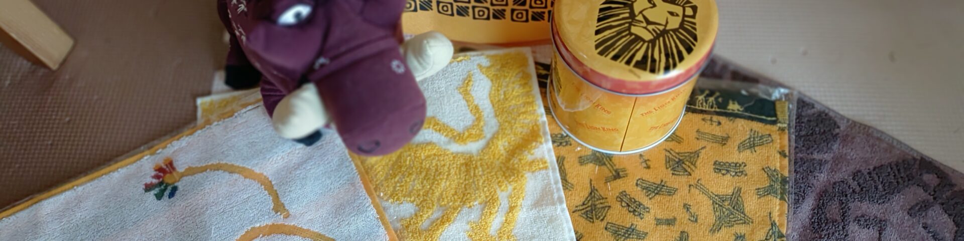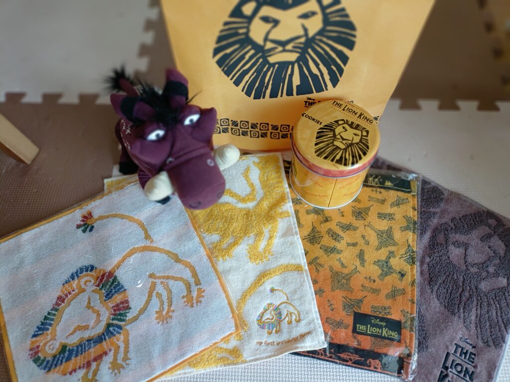 劇団四季ライオンキングはなんと、27周年なんだそうです。長い。ステキなグッズがたくさん並んでおりましたが、我々は、ハンドタオルとクッキー缶とチャームと、あとなんと、息子氏はちゃっかりプンバァのぬいぐるみをばぁばに買ってもらっていた。何ぃっ!